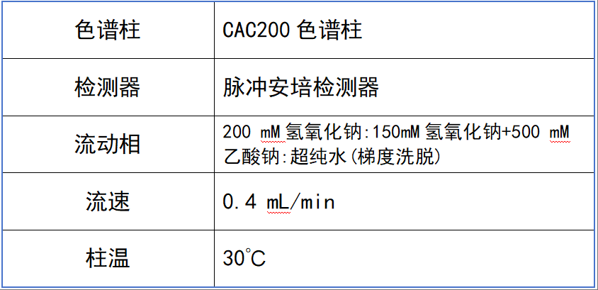 SH-CAC-200 色譜柱可以快速高效地分離單糖、雙糖,具有理想的分離度;與脈沖安培檢測 (PAD) 相結合,在高 pH 條件下可進行高分辨率的分離,無需衍生化。