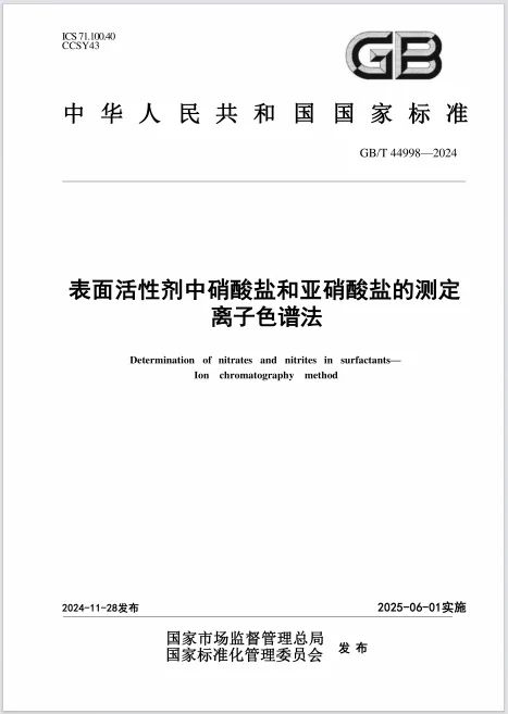 為全面提升表面活性劑產品質量管控,保障日化用品健康安全,由盛瀚參與起草的國家標準GB/T 44998-2024《表面活性劑中硝酸鹽和亞硝酸鹽的測定 離子色譜法》將于2025年6月1日正式實施。